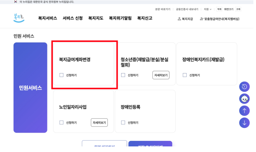 - 상단 메뉴에서 서비스 신청 → 민원서비스 신청 → 복지급여 계좌변경 클릭
